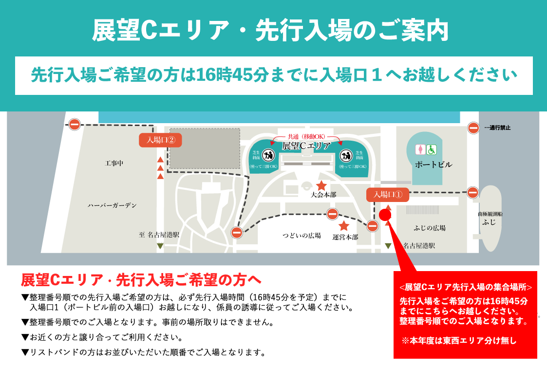 - 整理番号順での先行入場ご希望の方は、必ず先行入場時間(16時45分を予定)に間に合うよう入場口1(ポートビル前の入場口)までお越しになり、係員の誘導に従ってご入場ください。